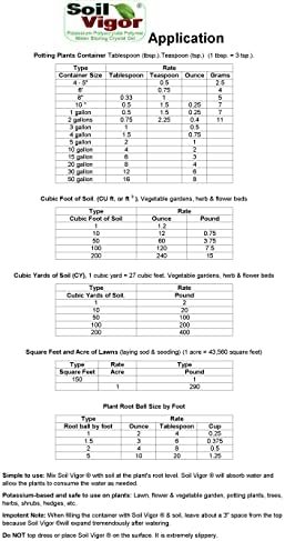 1 Lb. Soil Vigor can cover 150 SQ. FT OF LAWNS. For potting plants: 6″-8″ pot-1/2Tbsp; See application on the package.