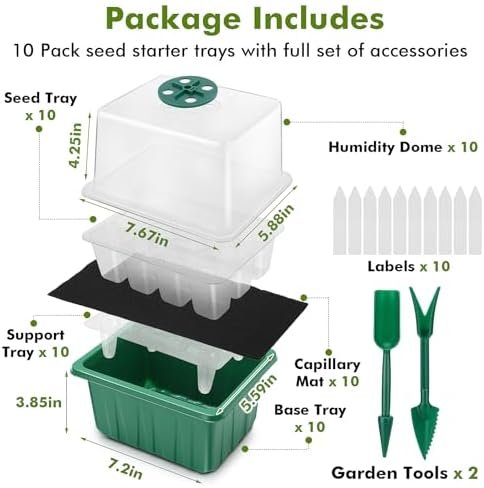 Package Includes: The seedling starter kit can expand to a large volume; includes 10 x Seed Tray, 10 x base trays, 10 x humidity domes, 10 x Capillary Mat, 1 pack of garden tools, and 10 garden labe