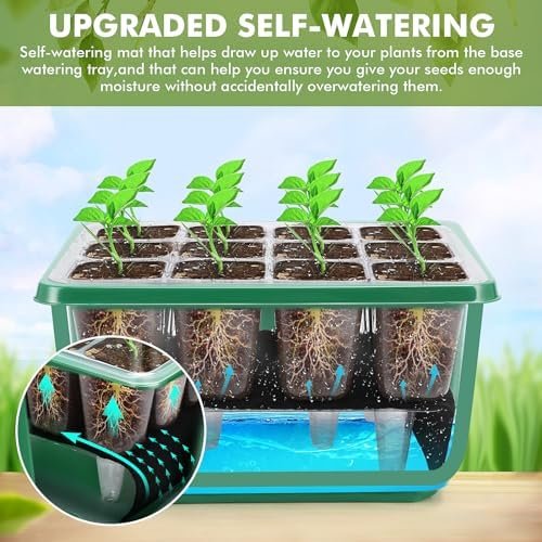 Self-Watering: The self-watering mat helps retain moisture if you forget to water one morning, because the self-watering mat helps draw up water to your plants from the base watering tray, this self-watering seed starting tray kit also can help you avoid overwatering your plants.