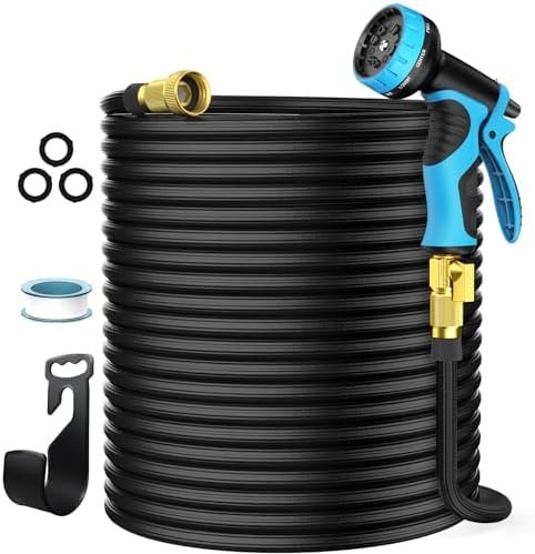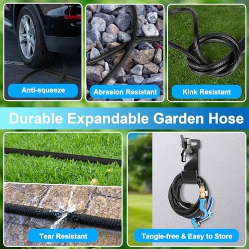 Ease of Use and Storage — This hose is expandable, portable, and can easily maneuver around obstacles. It is flexible, tangle-free, easy to install and saves storage space, making it convenient for storage. It is lightweight and suitable for children, the elderly, and individuals who cannot lift heavy objects. We also provide a hose hanger to secure the hose for better storage. It is more flexible and lighter than traditional plastic hoses and more durable than woven fabric expandable hoses.
