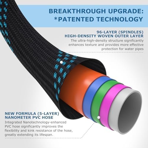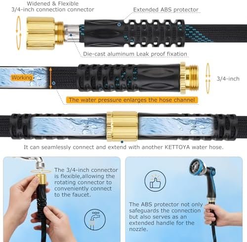 Super Leak-proof: KETTOYA garden hoses feature an ultra-high-density outer layer that effectively shields the inner tube. With a 5-layer integrated nano PVC thickened inner tube, the hose pipe offers ample flexibility and durability, ensuring seamless water flow while also rendering the hose leak-proof and tear-resistant. Moreover, they employ full-cover aluminum pressing technology, further enhancing their leak-proof performance.