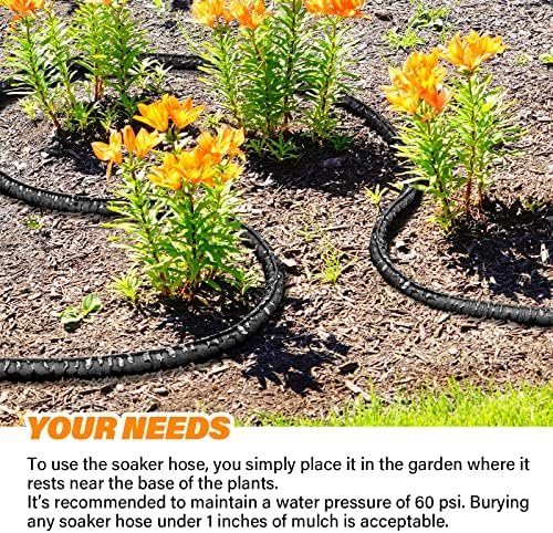 【Save 80% Water & Save Time】With the kink-free garden soaker hose, water efficiently reaches plant roots and soil without evaporation, resulting in up to 80% water savings.Also significantly reduces your watering time.Whether positioned above ground or nestled beneath leaves, the hose operates effectively when water pressure remains under 60 PSI.