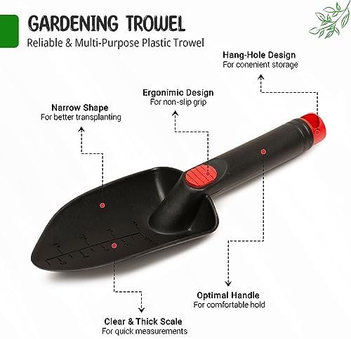 Introducing our 11″ Heavy Duty Plastic Gardening Hand Trowel, the all-in-one solution for all your gardening and outdoor needs. Whether you’re backpacking, camping, or simply tending to your indoor garden, this hand trowel is the perfect companion. Crafted for a multitude of tasks like digging, planting, scooping soil, or even gutter cleaning, this multi-functional tool is an essential addition to your gardening toolkit. The narrow spade design is ideal for transplanting, allowing you to dig into small spaces with ease. Going camping or to the beach? Don’t forget to pack this lightweight trowel to handle tasks like scooping sand or seed dispersal for birds. Inspired by trusted brands like Fiskars, our trowel offers ergonomic, non-slip grip and a hang-hole for convenient storage. The clear, thick scale provides quick and easy measurements, while the durable plastic ensures that this magic tool is built to last. Get yours today and make gardening and outdoor adventures more enjoyable!