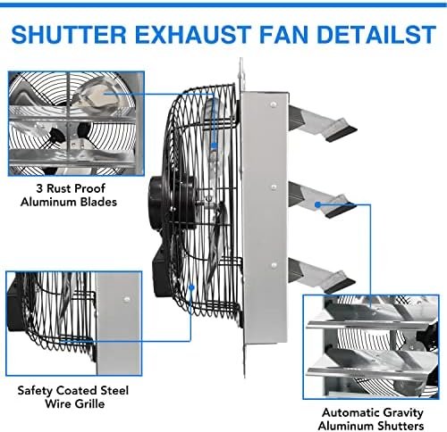 Perfect for removing excess heat, moisture,dust and odors from any residential or commercial spaceRust proof 3 aluminium blades improve air velocityWeather resistant aluminum shutterCorrosion resistant wire GuardsAutomatic Shutters that open and close in tandem with the operation of the fanFully enclosed motor is thermally protected and permanently lubricated for easy maintenance