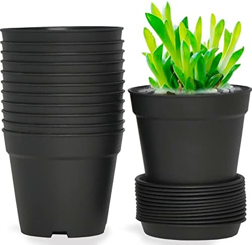 12 Pack 4 inch Plastic Planters, Seedlings Plant Nursery Pots with Drainage Holes and Saucers for Plants Flowers Succulent and All House Plants, Black