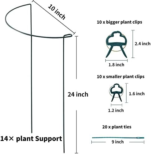 14 Pack Plant Stakes, 10″ W x 24″ H High Half Round Ring Peony Cages and Supports with Plant Clips and Ties, Green Garden Plant Support Ring for Outdoor Plants Tomato, Flowers, Hydrangea