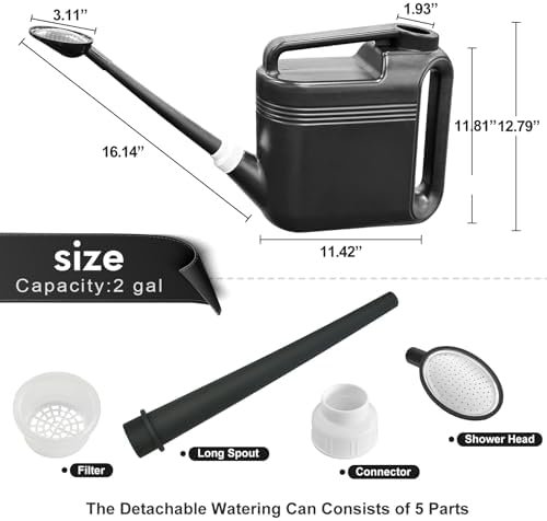 [EASY WATERING, CAREFUL CARE]-Plant watering can has a removable long spout, which is convenient for daily carrying and storage. When installing, pass the connector through the spout and tighten it to achieve a good sealing effect. 2 gallon watering can with a long spout can help you water plants that are far away more easily. You can accurately water to any needed area without bending down, so that every part of the plant can absorb enough water.