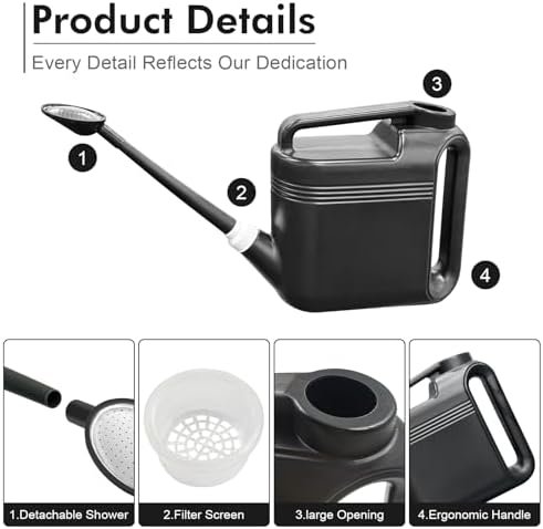 [EVERY DETAIL IS ATTENTIVE]-Watering can outdoor has a large opening at the top so you can quickly fill it with water under the faucet and easily clean the stains inside.A filter screen is placed at the connection of the spout to help you filter out impurities.Garden watering can comes with two ergonomic handles that provide a more comfortable holding experience. When large watering can is filled with water, the two handles can help you tilt and lift it better, increasing the convenience of use.