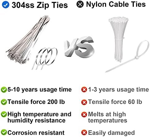 5-10 YEARS SERVICE LIFE : ZOUNI metal zip ties heavy duty have a long service life of 5-10 years at room temperature outdoors, which can ensure the stable performance of the tied objects for a long time and save the cost of frequent replacement of nylon ties.Anti-corrosion and high temperature resistance ensure the beauty of the environment and fire prevention requirements. It is not easy to be leached by acid, alkali, salt and other chemical components.