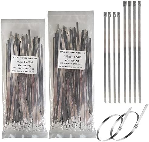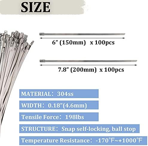 200PCS METAL CABLE ZIP TIES : You will receive 100pcs of 13.8″ and 100pcs of 15.7″ 304 stainless steel heavy duty zip ties, 0.18″ wide. 2 different sizes can be used for different projects. The surface of the cable zip ties is polished and the edges on both sides are rounded without hurting your hands.