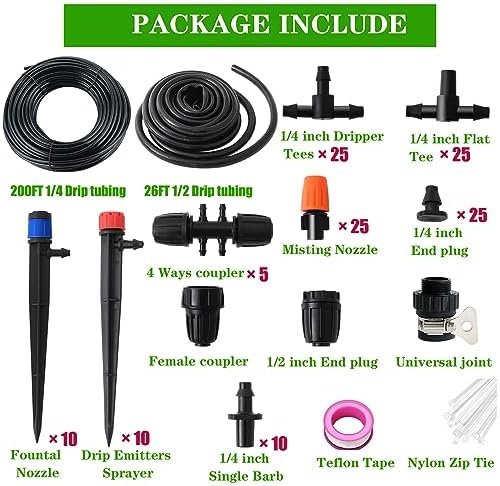 Water Your Entire Garden with Ease: Drip Irrigation System Kit consists of 158 pieces, including 26FT 1/2 Drip tubing, 200FT 1/4 Drip tubing,1pcs Female coupler, 1pcs Universal joint,4pcs 4 Ways coupler, 1pcs 1/2 inch End plug, 25pcs 1/4 inch Flat Tee, 25pcs1/4 inch Dripper Tees, 1pcs Teflon Tape, 25pcs End plug, 10pcs 1/4 inch Single Barb,10pcs Fountal Nozzle, 10pcs Drip Emitters Sprayer, 25pcs Misting Nozzle, 20pcs Nylon Zip Tie.