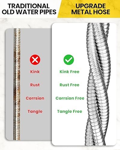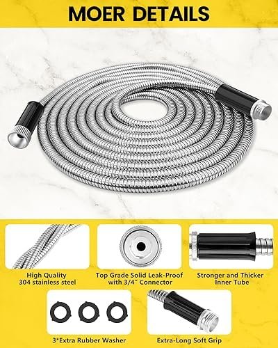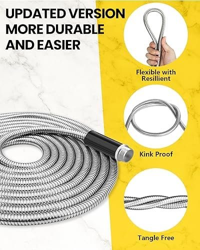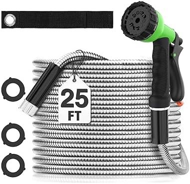 Double-Layer Structure: The 25-ft stainless steel metal hose features a unique double-layer structure that combines a flexible inner tube with a protective metal layer. This innovative design strikes the perfect balance between lightweight maneuverability and long-lasting durability. Weighing a mere 3 lbs, our hose is easy to handle and navigate around your yard, making it an excellent choice for the elderly and those with mobility issues.