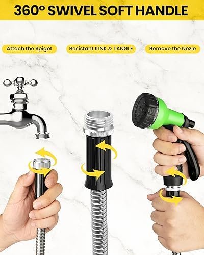 Material and Durability: The hose is made of high-quality stainless steel and thickened PVC, ensuring resistance to pressure, pet bites, cactus punctures, and dragging over rough surfaces. It won’t rust, burst, leak, tear, or corrode, offering long-lasting durability and eliminating the need to replace your garden hose every year.