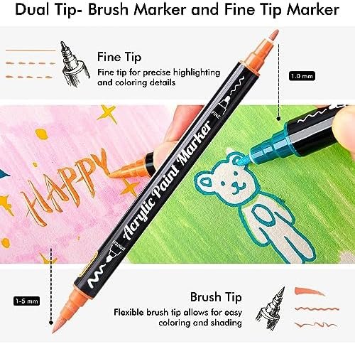 【UNIQUE DUAL TIP DESIGN】: Each acrylic paint marker come with a 1-5mm flexible fiber brush tip and 1mm fine tip, allows you to create medium or bold strokes by changing brush pressure and experience fine strokes with fine tip. Our tips are made of special fiber material which is wear-resistant, no branching and durable for a really long time.