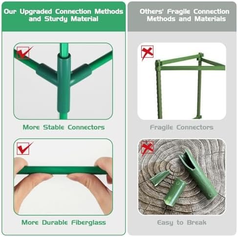 【Upgraded Tomato Cages for Vertical Growth】Our upgraded tomato cages for garden 48 inches, made with durable fiberglass, offer heightened sturdiness, durability, and eco-friendliness. Unlike many triangular structures, our four support stakes create an stable rectangular framework. The square design, featuring reinforced connector pipes, offers robust support for climbing plants to grow vertically. Wrapped in a non-fading green plastic coating, they blend in with surrounding plants.