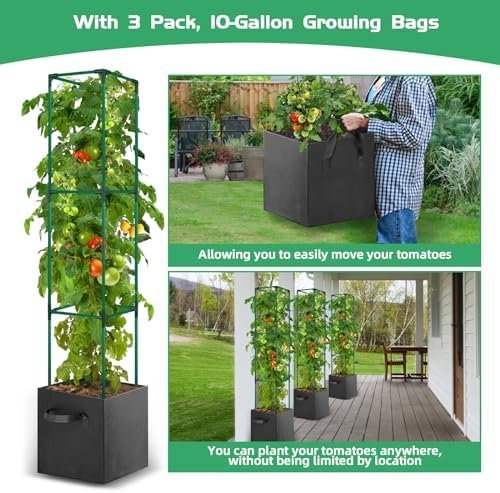 【3Pcs 10 Gallon Grow Bags】Our tomato trellis kit includes 3 durable 10-gallon tomato planter with a thickened bottom, capable of supporting a full bag of soil and plants. Excellent air permeability and drainage prevent root circling and rotting, promoting healthy plant growth. Equipped with thick handles, these grow bags are easy to move, making them perfect for growing potatoes, tomatoes, chili, and various greens.
