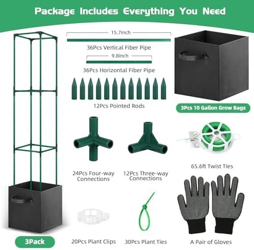【Tomato Stakes Kit】This garden plant stakes kit comes with everything you need for tomato gardening, including 3 sets of 48-inch tomato cages, 3 durable 10-gallon grow bags, 36 connectors, 12 pointed rods, 65.6ft of versatile twist ties, 20 convenient plant clips, 30 flexible plant ties, and a pair of protective gloves. Perfect for nurturing climbing fruits, vegetables, and flowers, allowing them to thrive vertically and flourish healthily.