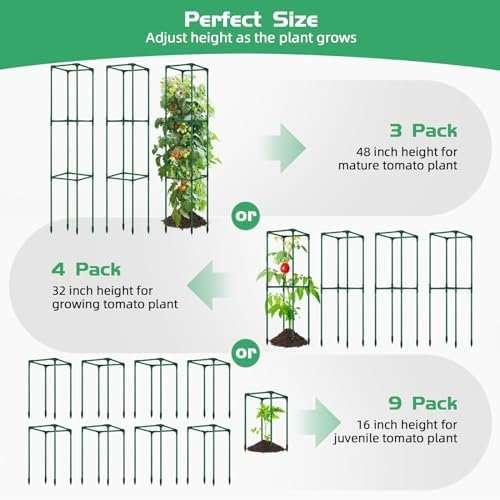 【Easy Custom Installation】Our tomato cages, garden beds and adjustable tomato stakes effortlessly install without needing extra help or tools. Furthermore, our square tomato cages adapt to various growth stages, offering vertical support for each phase. With 3 sets of 48-inch tomato cages, adjusting the height to 32 inches you get 4 sets, and at 16 inches, you get 9 sets. Tailored support guarantees healthier, more productive plants, maximizing the yield of delicious, locally-grown tomatoes.