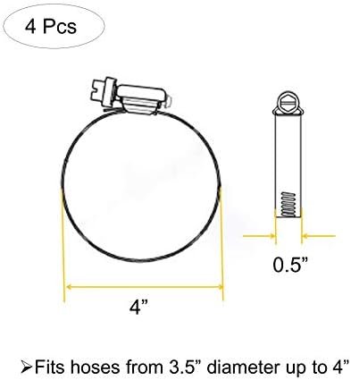 Package includes: 4 Pieces 4″ hose clamps, fits hoses from 3.5” diameter up to 4”.