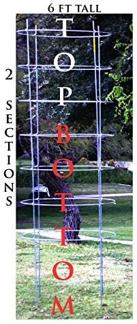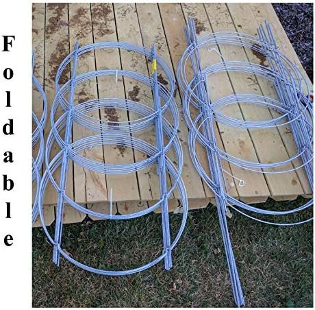 Each order has 4 Cages that assembled are 6 ft tall and 20 inches in diameter. Each cage has two sections; bottom 3.5 ft tall, top 2.5 ft tall. The bottom section has sharp legs that go into go into the ground 1.5 – 2 ft for stability. It also has tubing connectors to connect both sections for assembly. Our product is 100% American made with 1/4 ” Dia. Galvanized Steel Rod. Our patented folding technology allows for easy storage.