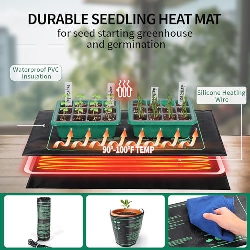 Indoor Greenhouse System: Waterproof seed heating mat can provide consistent, uniform heating temperatures of approx. 90°F to 100°F (32-37℃), to creat a warm environment for speeding up seed germination and plant rooting, and won’t damage your seeds
