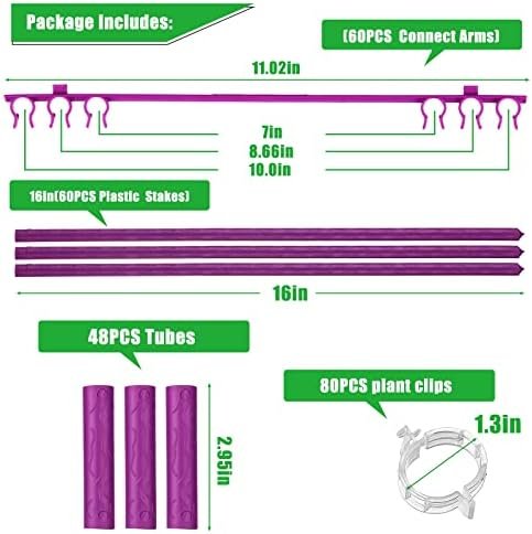 Package Includes: the package comes with 60 pcs 16 inch plastic-coated hollow steel plant stakes, 48 pcs cylindrical connecting pipes, 80 pcs plant clips and 60pcs adjustable stake arms, every 5 plant stakes can form a long 80 inch plant stake