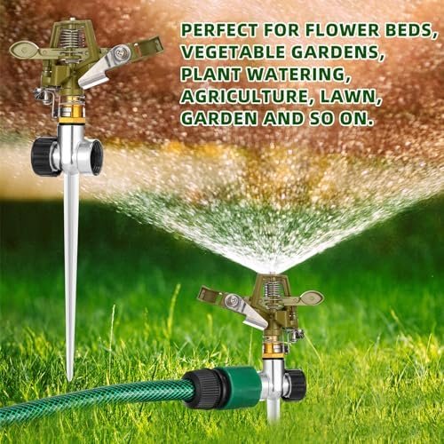 Versatile Compatibility and widely applied: the spike sprinklers for lawn watering are compatible with most US standard 3/4 inch threads, making them great for watering lawns, gardens, terraces, yards, and grass fields; They can also be applied in greenhouses or flower beds; The impact sprinkler adds an element of amusement in the irrigation process while also being efficient