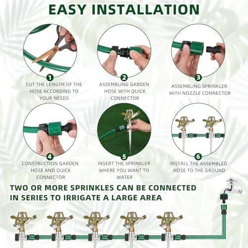 Simple and Adaptable Setup: our brass impact sprinkler is user friendly; Intuitively designed for simple installation without tools, allowing you to adjust the hose length as per your requirements; You can conveniently choose the spacing and position of each sprinkler head, and with the rotating coupling nuts feature, connecting units is straightforward; The easy assembly process does not require any tools, making it user friendly even for those new to gardening