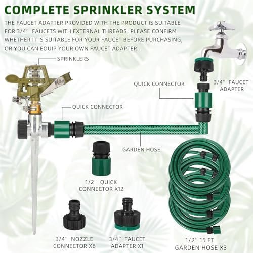 Comprehensive Garden Watering Kit: the above ground sprinkler kit includes 4 heavy duty sprinklers for large areas, 3 roll of 1/2″ garden hoses, 4 nozzles connectors, 8 quick connectors, and 1 piece of 3/4″ faucet adapter; This complete package ensures you have everything you need for irrigation and watering across your premises, be it a lawn, patio, flower beds, or even a greenhouse