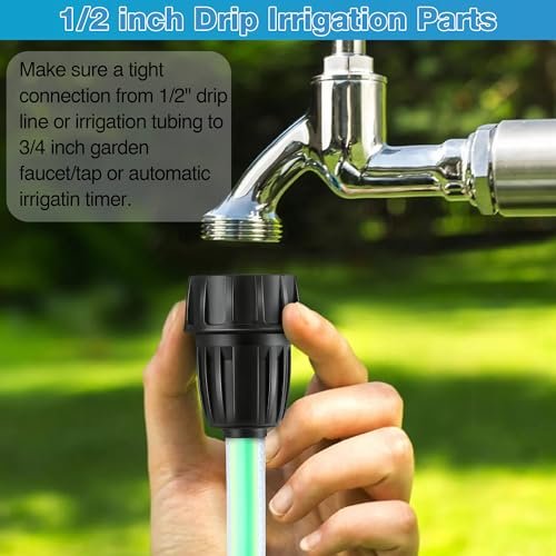 1/2” Drip Irrigation Tubing Adapters: easily connect 1/2″ drip irrigation tubing to any standard 3/4″ faucet, hose bibb, or garden hose with our drip irrigation tubing adapters; The 3/4″ female hose thread to 1/2 tubing connector ensures a snug fit, and the installation process is quick and requires no tools, making it convenient for all users