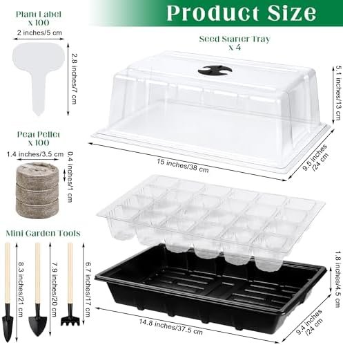 Product size: each seed starter tray measures about 14.8 x 9.4 x 1.8 inches/37.5 x 24 x 4.5cm; the transparent lid measures about 15 x 9.5 x 5.1 inches/38 x 24 x 13 cm; the diameter of peat particles is about 1.4 inches/3.5 cm, the thickness is about 0.4 inch/1 cm; the label measures 2 x 2.8 inch/5 x 7 cm; the high dome design is suitable for tall seedlings