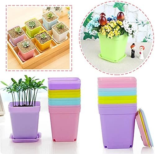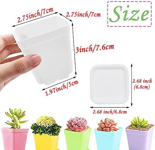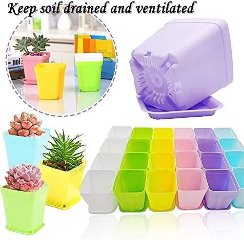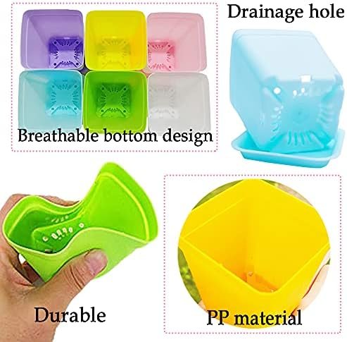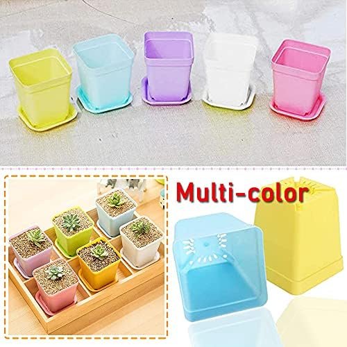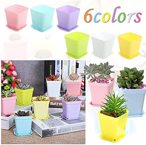 Package Includes: 48 square plastic plant pots with 48 drain trays in 6 colors (white, blue, purple, green, yellow, pink)