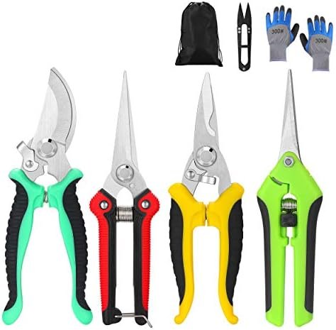 PACKING LISTING: The packing include pruning shear, fruits shear, flower cutter, leaves trimmer, one pair glove, one organizer bag.Those pruning shears could satisfy need of planting, harvesting, floral, indoor and outdoor planting, greenhouse pruning.