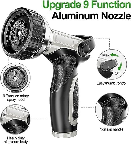 【Upgrage Aluminum Nozzle】The upgraded 9 ways sprayer is made of aluminum metal, heavy and sturdy. The thumb can control the size of the water flow, making it more convenient to use