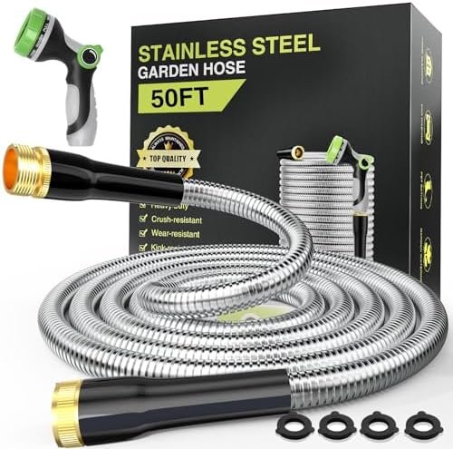 【What You Get】- Arrives with a 50ft garden hose, a 10-pattern hose nozzle, 4 spare rubber gaskets. We also provide excellent after-sales service. If you have any questions, please contact us via: 1. QA 2. Amazon message center. Get ready to conquer your garden with a burst proof, rust resistant, heavy duty and flexible metal water hose 50ft.