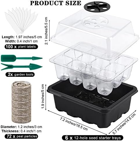 Plant germination starter kit: you will receive 6 sets of 12-hole black seed starter tray kit, 72 pieces of peat pellets, 100 pieces of plant labels, and 2 pieces of garden tools; the peat pellets can be used alone or to help reduce root damage caused by transplantation, making the planting process more convenient