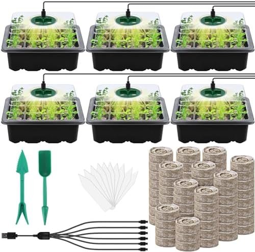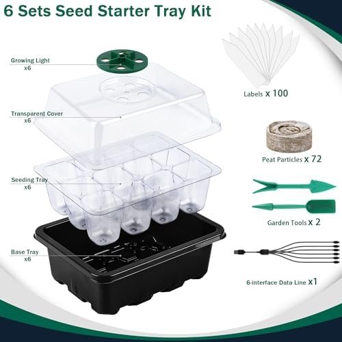 Seedling cultivation set: you will receive 6 sets of 12-cell black seedling trays, 72 pieces of peat particles, 6 pieces of LED light covers, 1 piece of USB data cable, 100 pieces of plant labels, and 2 garden tools; the complete garden tool set is an ideal gift for you, and use the peat particles can help you reduce root damage caused by transplanting and makes the planting process easier