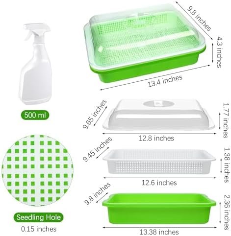 Packaging includes: you will receive 6 sets of seed sprouter trays with lids and 1 piece of 500 ml spray bottle, enough to meet your planting need; each seed sprouter tray with lid as a whole measures 13.4 x 9.8 x 4.3 inches, the lid is 12.8 x 9.65 x 1.77 inches, the inner tray is 12.6 x 9.45 x 1.38 inches, the bottom tray is 13.38 x 9.8 x 2.36 inches, and the seedling hole is 0.15 inches, the completed sprouts growing kit is enough for you to use