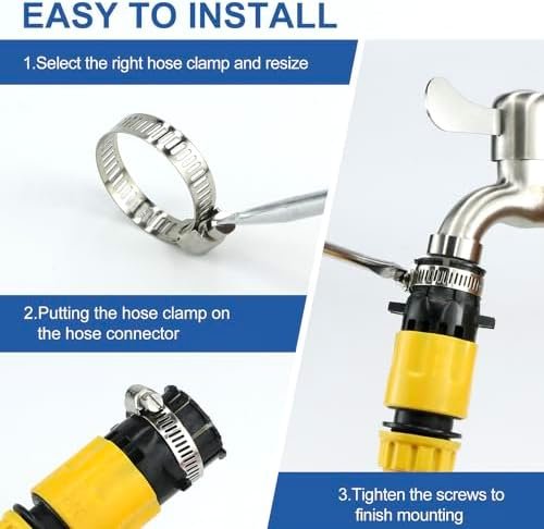 【EASY TO INSTALL】Select the right hose clamp and resize, putting the hose clamp on the hose connector, and tighten the screws to finish mounting.