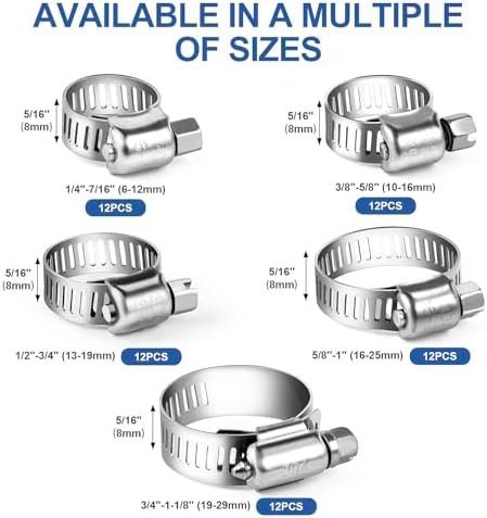 【MULTIPLE SIZES】Hose clamp kit has five adjustable sizes, include 12pcs-1/4″-7/16″(6-12mm), 12pcs-3/8″-5/8″(10-16mm), 12pcs-1/2″-3/4″(13-19mm), 12pcs-5/8″-1″(16-25mm), 12pcs-3/4″-1-1/8″(19-29mm). Wide range of adjustable sizes, enables you to handle various scenarios with ease.