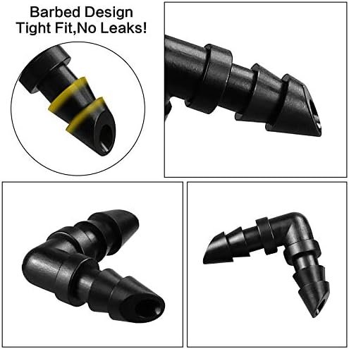【BARBED DESIGN】:Barbed elbow fittings tight fits universal 1/4″ drip tubing,barbed design ensures the tubing will not slip and leak.