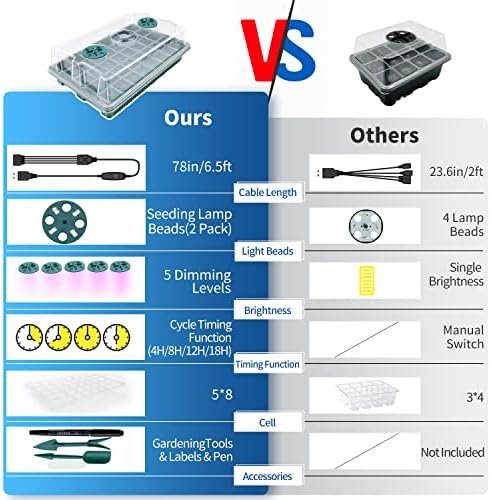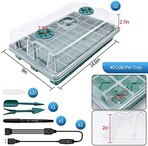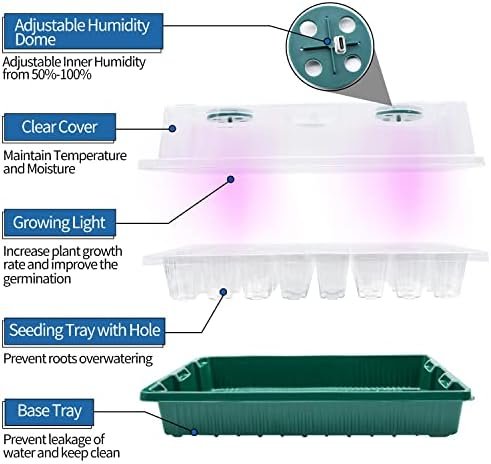 【Adjustable Bright&Humidity】- Each seed starter tray is equipped with 2pcs humidity dome with growing light on them, you can rotate the dome to adjust humidity from 50% to 100%, and you can use the included 78in/6.5ft cable to control the 5 dimmable levels(20%, 40%, 60%, 80%, 100%) and cycle timing function(4H/8H/12H/18H).