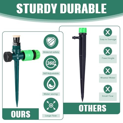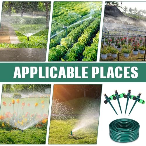 Adjustable Nozzles and Stable Ground Spikes: equipped with quality ABS plastic nozzles, our irrigation system for gardens offers precise control from 0° to 360°; It allows you to adjust the spraying angles and directions while moving the ground spikes; Moreover, the provided 7.79 inch high ground spikes ensure stability and water height, offering deep penetration without any shake or fall due to water pressure