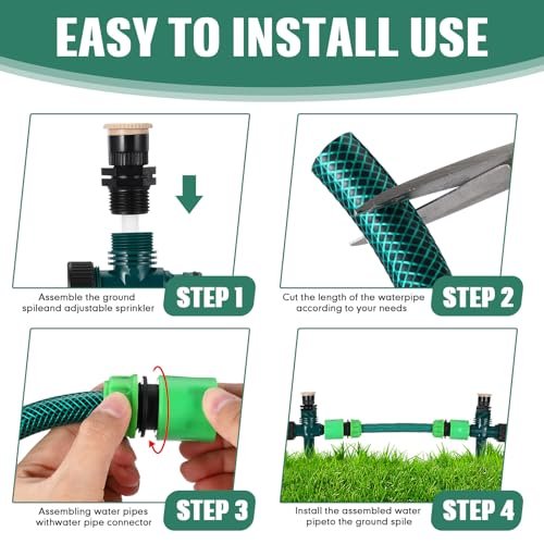 Easy Installation and Wide Accessibility: no tools are required to install this DIY sprinkler system kit; It includes grass green quick connectors that easily connect your garden hose to the lawn sprinkler; This water sprinkler system also features a universally applied faucet adapter that can connect easily to your outdoor faucets, timers, filters, and more; All you need to do is press the quick connector to securely connect the hose to your yard sprinkler
