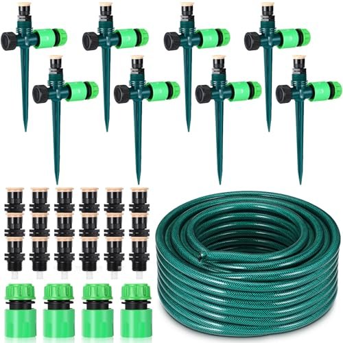 82 Ft 1/2 inch Standard Hose Multi Adjustable Garden Above Ground Sprinkler System Kit Irrigation Garden System 8 Sprinklers and 16 Hose Connectors Watering Set DIY Plant Watering Set