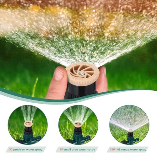 Wide Coverage for Irrigation: our above ground sprinkler system kit ensures broad water coverage for your garden or lawn; Each sprinkler head covers up to 840 sq. ft. at 50 PSI pressure, delivering enough water to keep your plants healthy; When set up in a series, it provides a combined coverage area of up to 1638 sq. ft; A nicely designed irrigation system for garden owners who prioritize plant health and water conservation