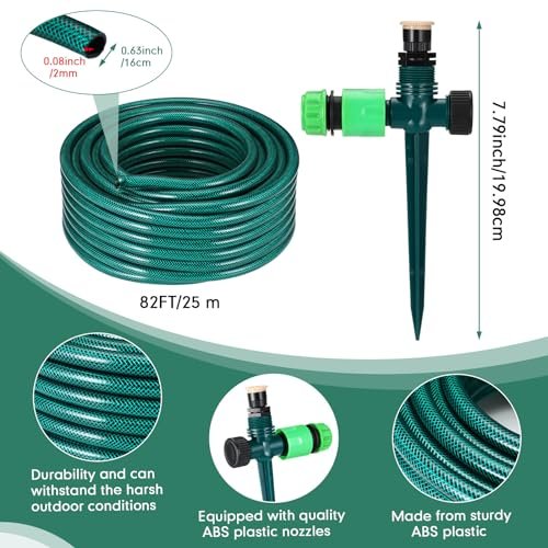 Quality Material and Ideal Size: the DIY sprinkler kit is mainly made from sturdy ABS plastic that assures durability and can withstand the harsh outdoor conditions; Our above ground sprinkler system kit includes 8 durable 7.79 inches ground stakes and a 84 ft/ 25 m long garden hose with an outer diameter of 0.63 inch/ 16 mm and thickness of 0.08 inch/ 2 mm; The robust material and size are ideal for a resilient lawn irrigation system
