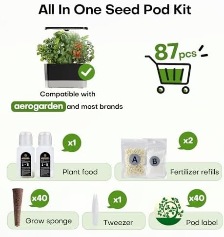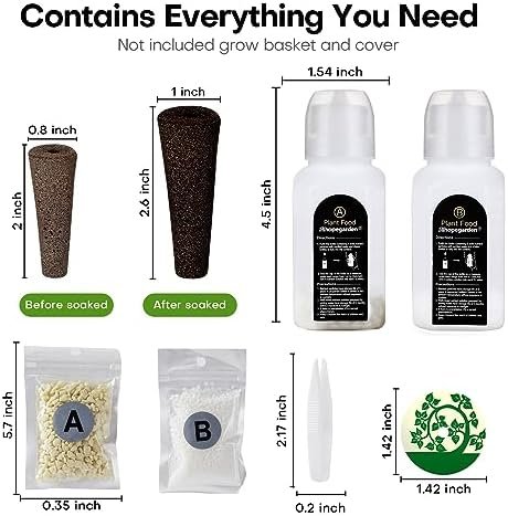 Contains Everything You Need: 87pcs indoor garden kit with 40 grow sponges, 40 pod labels, 6 pieces total of 600ml A&B nutrients (including 4 fertilizer refills), 1 tweezers. You can plant anything you want in the hydroponic growing systems