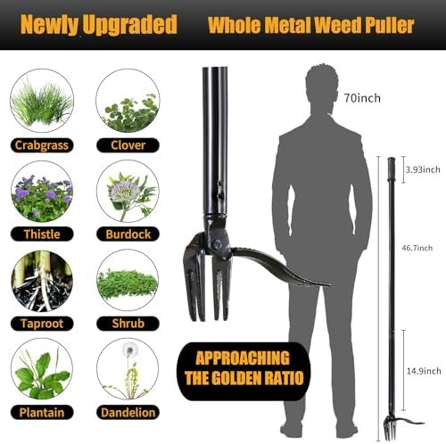 【Ergonomic Design】Using this standing weed puller eliminates the need for bending over or crouching down. With its 47-inch length, which closely matches the golden ratio, and weighing 45 pounds, it allows for easy usability for most individuals