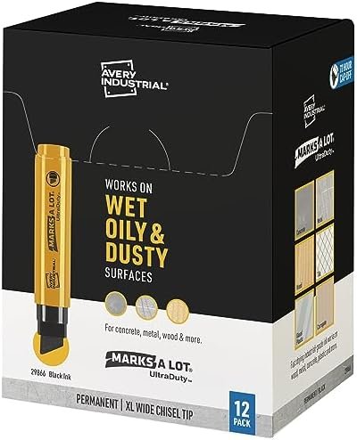 Get the job done with this 12 pack of Avery 29866 Marks A Lot UltraDuty markers with XL chisel tips. Built for situations where standard permanent markers just aren’t enough, Avery Marks A Lot UltraDuty markers are perfect for construction sites, warehouses, workshops and more. The bold fast-drying ink works great on plastic, wood, metal, corrugate and concrete. The durable XL chisel tip also works on abrasive, dusty, wet and oily surfaces without clogging. The angled 18mm chisel tip also allows you to write lines in varying widths to switch from narrow to bold on the spot. Specially engineered to resist water, abrasion and smearing, the heavy duty ink makes sure that your writing will last through even the harshest of conditions. The durable ink is designed to last and won’t dry out when the cap is left off for up to 72 hours. The cap also features a useful anti-roll bump to help prevent rolling. Includes 12 black Avery markers. Please Note: The industrial-grade ink has a stronger odor than traditional permanent markers.